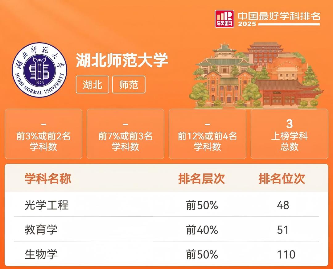 近日,高等教育评价专业机构软科正式发布“2025软科中国最好学科排名”。全国共有517所高校的5344个学科点上榜,其中湖北省有26所高校的311个学科入选。我校教育学、生物学、光学工程3个学科首次上榜,排名百分位段分别位列学科前34%、前45%、前49%,标志着学校学科建设水平迈上新台阶。